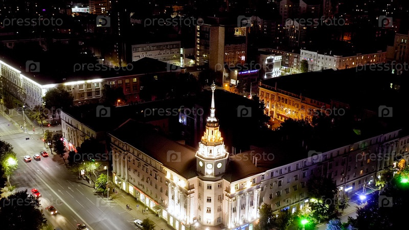 Воронеж, Россия - 23 августа 2020: Площадь Ленина. Дом с башней и часами. Гостиница 'Воронеж'. Ночной вид на город, взгляд из воздуха