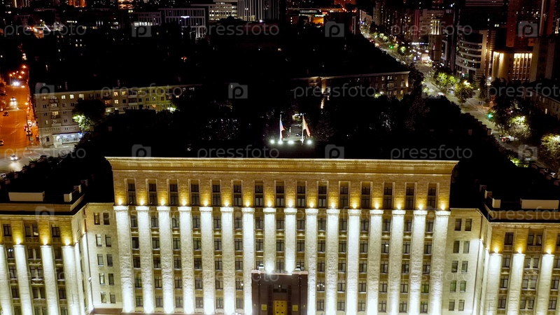 Воронеж, Россия.Площадь Ленина.Здание правительства Воронежской области.Ночной вид на город, взгляд с воздуха