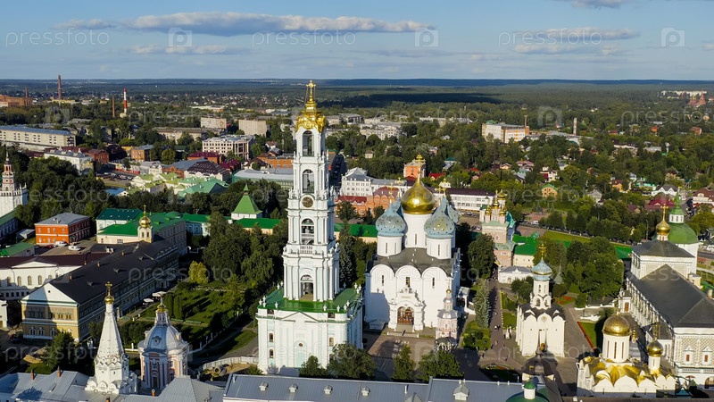 Сергиев Посад, Россия.Троицко-Сергийская лавра - крупнейший мужской монастырь Русской православной церкви с долгой историей.Расположен в центре Сергиева Посады.Солнечный свет, взгляд из воздуха