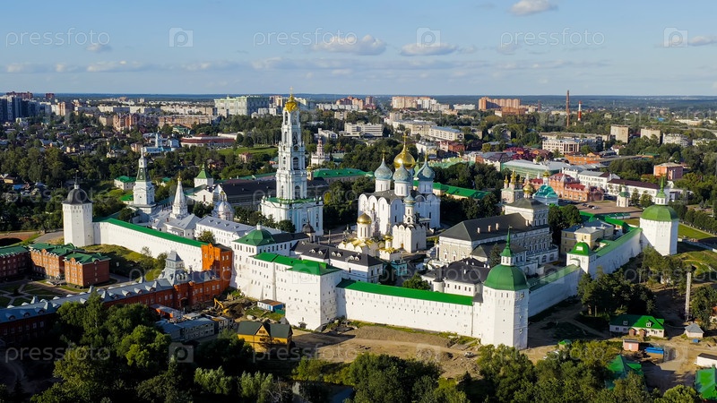 Сергиев Посад, Россия.Троицко-Сергийская лавра - крупнейший мужской монастырь Русской православной церкви с долгой историей.Расположен в центре Сергиева Посады.Солнечный свет, взгляд из воздуха