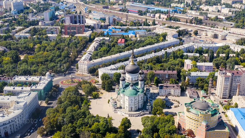 Воронеж, Россия - 23 августа 2020 года: Кафедральный собор Благовещения - Православная церковь Русской православной церкви, главный храм Воронежской митрополии, взгляд с воздуха