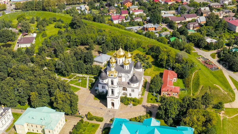 Дмитров, Россия.Собор Вознесения Пресвятой Богородицы расположен в Кремле имени Дмитрива.Архитектурный памятник начала XVI века, вид с воздуха
