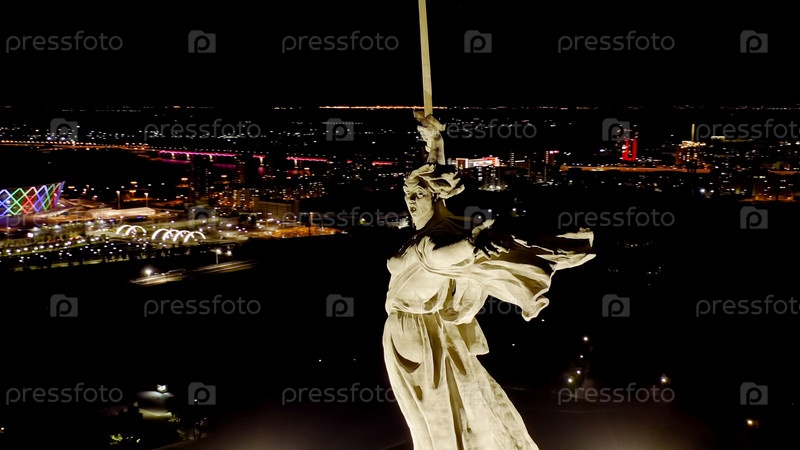 Ночной вид скульптуры Родина зовет! на Мамаевском кургане в Волгограде, взгляд из воздуха