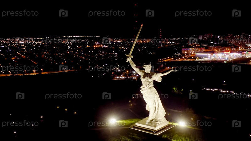 Ночной вид скульптуры Родина зовет! на Мамаевском кургане в Волгограде, взгляд из воздуха
