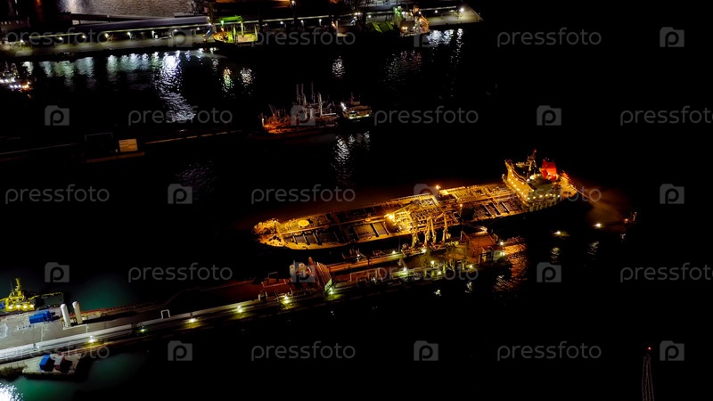 Новороссийск, Россия. Порт Новороссийск ночью. Городские огни ночью. Залив Цемес в Черном море, Aerial View