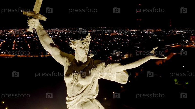 Волгоград, Россия - 19 сентября 2020 года: Ночной вид скульптуры 'Родина зовет!' на Мамаевском кургане в Волгограде