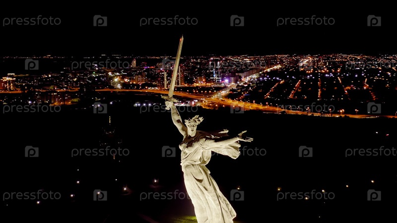 Ночной вид скульптуры Родина зовет! на Мамаевском кургане в Волгограде, взгляд из воздуха