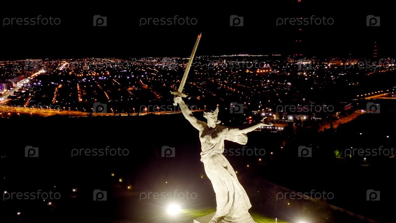 Ночной вид скульптуры Родина зовет! на Мамаевском кургане в Волгограде, взгляд из воздуха