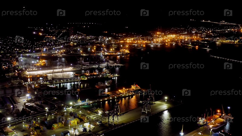 Новороссийск, Россия. Порт Новороссийск ночью. Городские огни ночью. Залив Цемес в Черном море, Aerial View