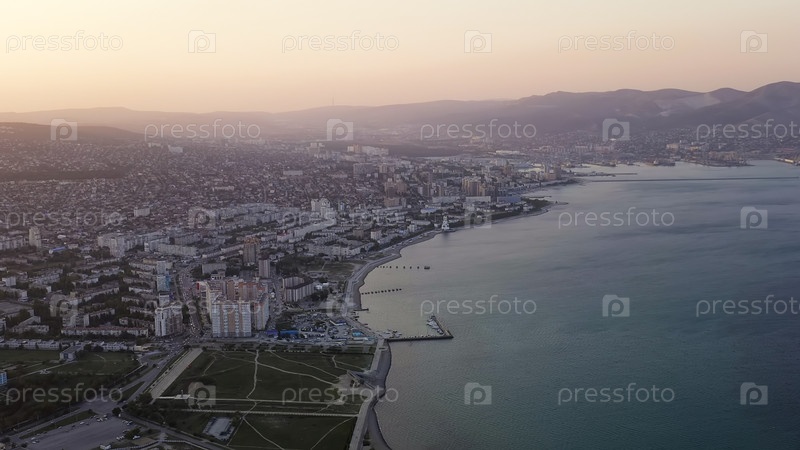 Новороссийск, Россия.Панорама города во время захода солнца.Городская набережная.Залив Цемес в Черном море, Aerial View