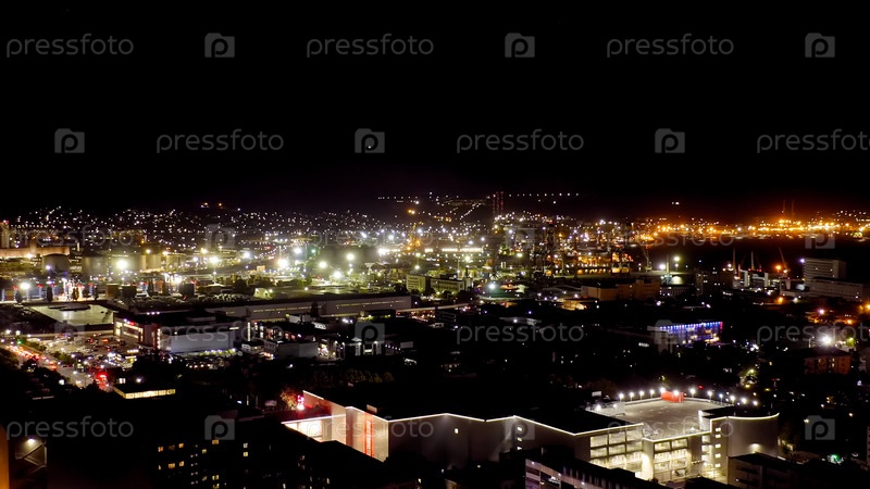 Новороссийск, Россия. Порт Новороссийск ночью. Городские огни ночью. Залив Цемес в Черном море, Aerial View