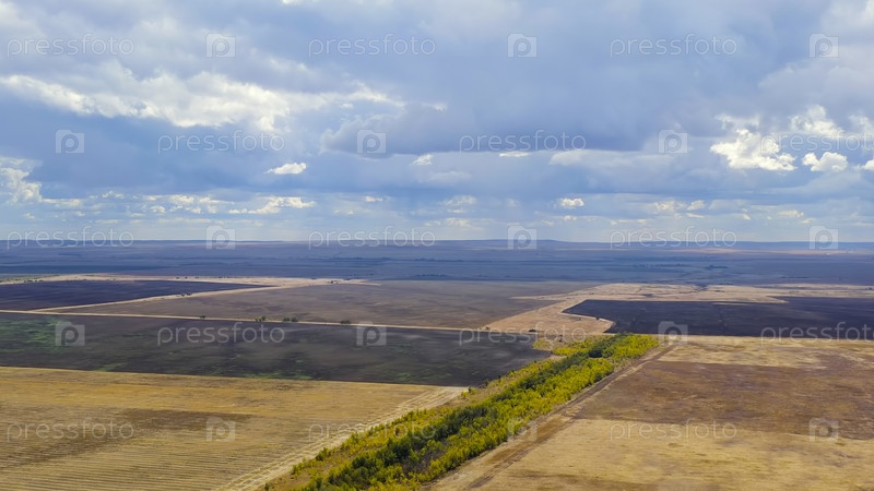 Россия.Сильные дождевые облака над осенними полями.Степь, вид с воздуха