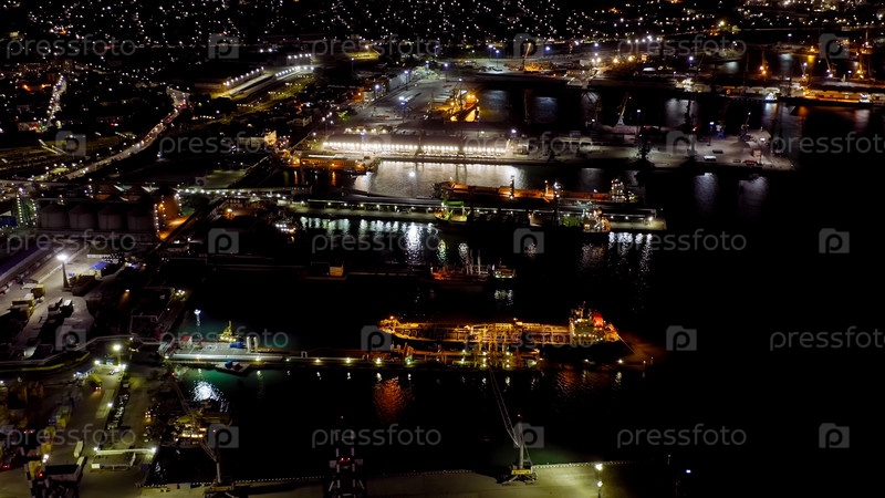 Новороссийск, Россия. Порт Новороссийск ночью. Городские огни ночью. Залив Цемес в Черном море, Aerial View