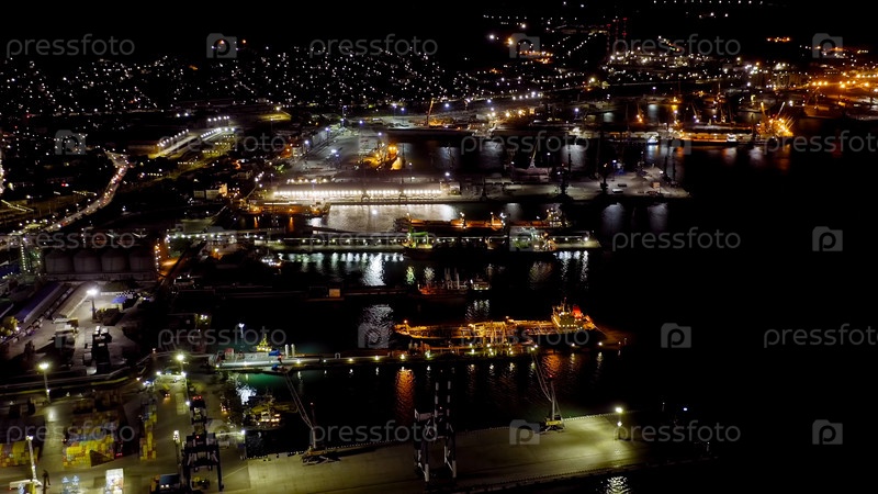 Новороссийск, Россия. Порт Новороссийск ночью. Городские огни ночью. Залив Цемес в Черном море, Aerial View