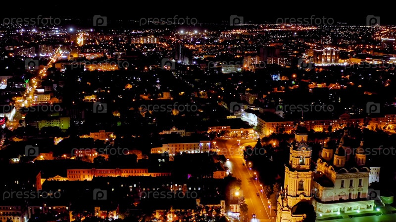 Астрахань, Россия. Колокольня Астраханского Кремля.Астраханский Кремль - белокаменная крепость, построенная в 16 веке.Ночь, вид с воздуха