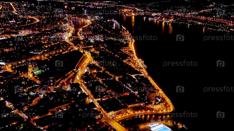 Астрахань, Россия. вид на город Астрахань ночью. набережная реки Волги, взгляд с воздуха