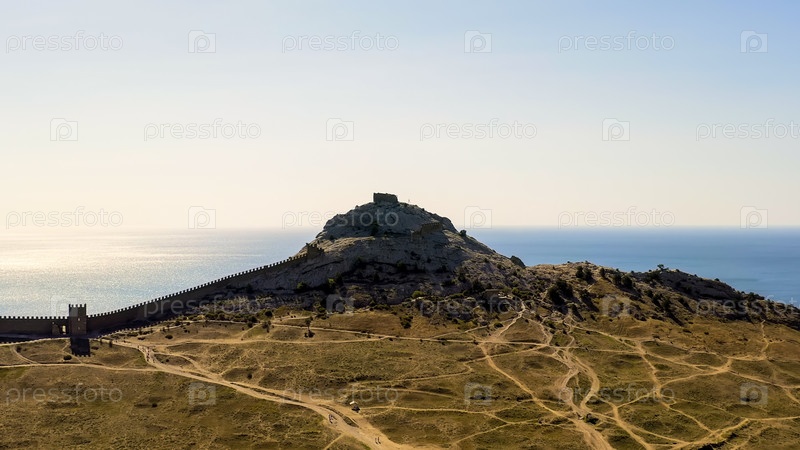 Судак, Крым. Генуэзская крепость в Судаке. Средневековая крепость площадью более 30 гектаров. На побережье Черного моря вид с воздуха