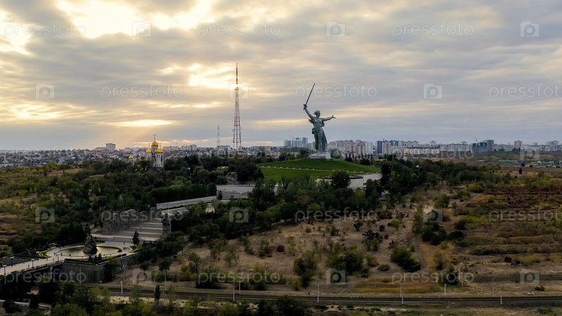 Волгоград, Россия. вечерний вид скульптуры 'Родина зовет!' на Мамаевском кургане в Волгограде. облачная погода, взгляд из воздуха