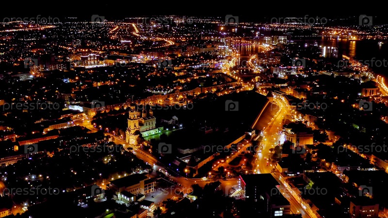 Астрахань, Россия. Колокольня Астраханского Кремля.Астраханский Кремль - белокаменная крепость, построенная в 16 веке.Ночь, вид с воздуха