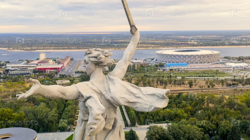 Волгоград, Россия. вечерний вид скульптуры 'Родина зовет!' на Мамаевском кургане в Волгограде. облачная погода, взгляд из воздуха