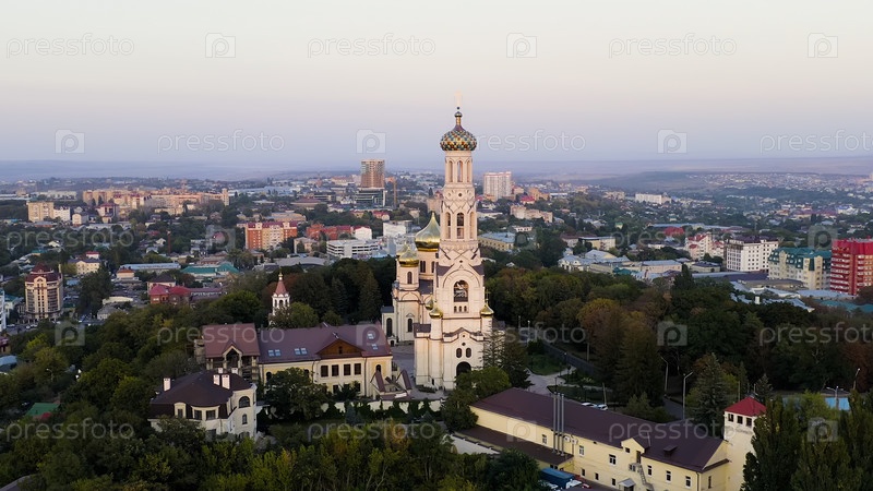 Ставрополь, Россия - 17 сентября 2020 года: Собор Казанской иконы Божией Матери в Ставрополе. время захода солнца, вид с воздуха