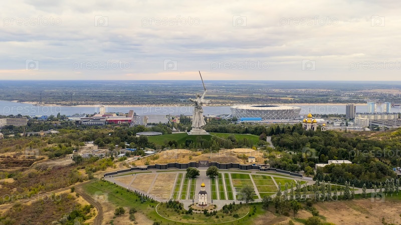 Волгоград, Россия. вечерний вид скульптуры 'Родина зовет!' на Мамаевском кургане в Волгограде. облачная погода, взгляд из воздуха