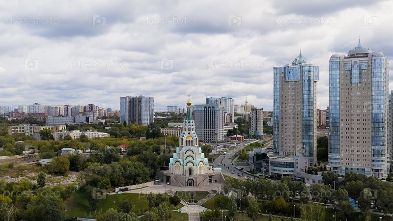 Самара, Россия - 20 сентября 2020 года: София Божьей Мудрости.Расположена на берегу реки Волги, вид с воздуха