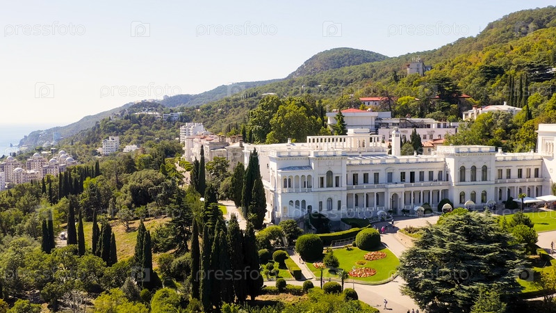 Ливадийский дворец - расположен на побережье Черного моря в деревне Ливадия, Ялтинская область Крыма, вид с воздуха