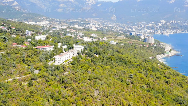 Ливадийский дворец - расположен на побережье Черного моря в деревне Ливадия, Ялтинская область Крыма, вид с воздуха