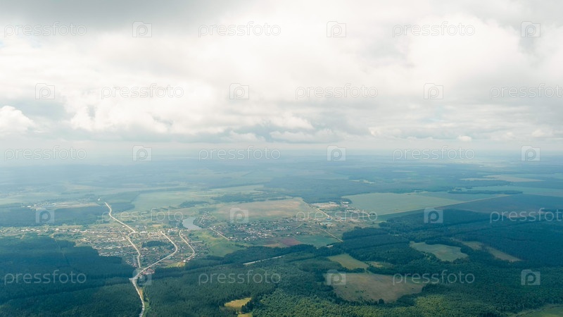 Летящий над лесом, полевой дорогой. Тени от облаков. Летающий через облака, вид с воздуха