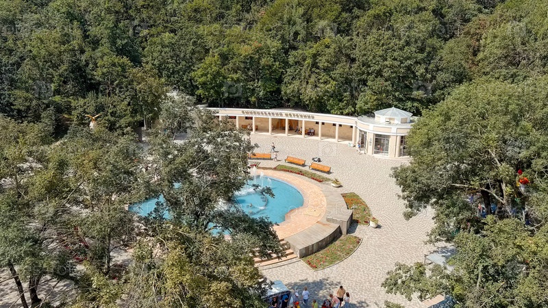 Железноводск, Россия 28 августа 2021: источник Смирновского. насосная комната Смирнова расположена на самом верху Каскадной лестницы в парке Aerial View Park