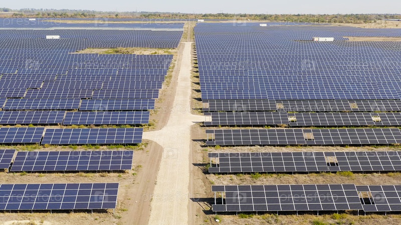 Солнечная электростанция в ясный солнечный день, Aerial View