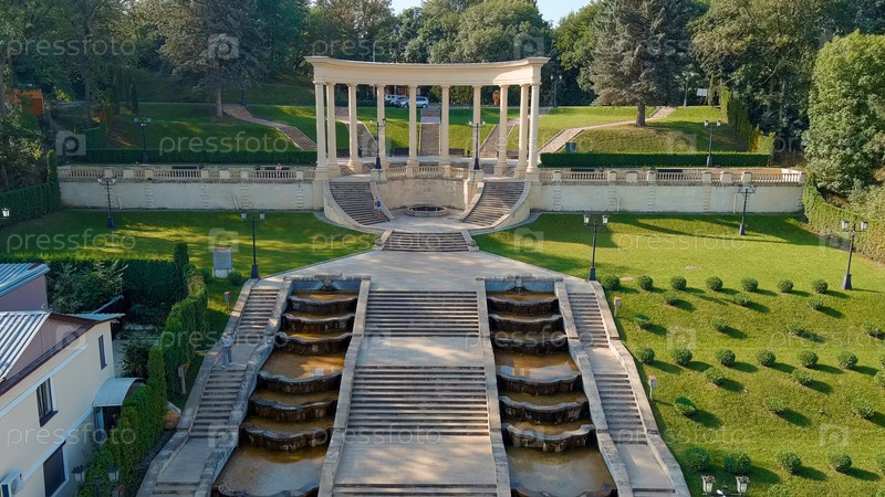 Кисловодск, Россия. Каскадная лестница. Чистое солнечное утро. Лето, вид с воздуха