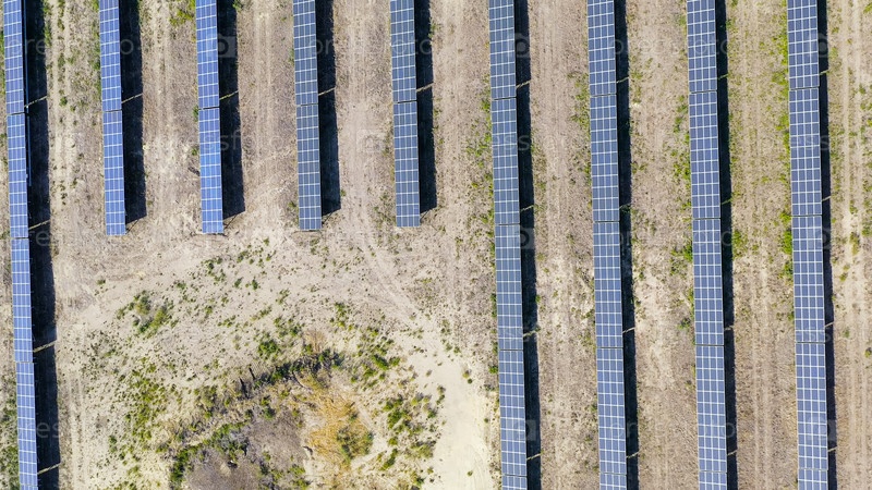 Солнечная электростанция в ясный солнечный день, вид с воздуха, головной удар