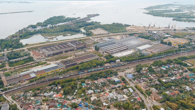 Индустриальная зона с железной дорогой.Панорамный вид на город и реку Волгу.Советская улица, Aerial View