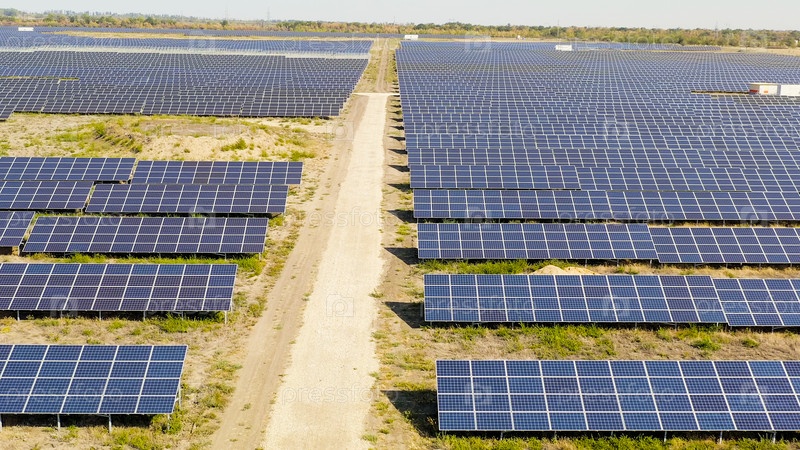 Солнечная электростанция в ясный солнечный день, Aerial View