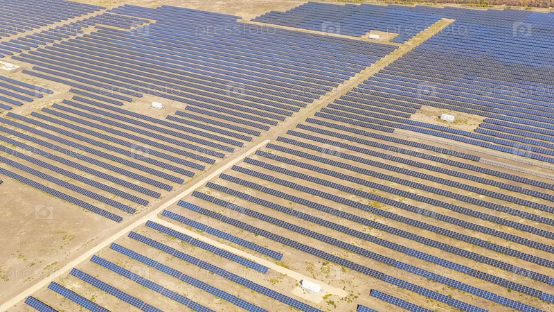 Солнечная электростанция в ясный солнечный день, Aerial View
