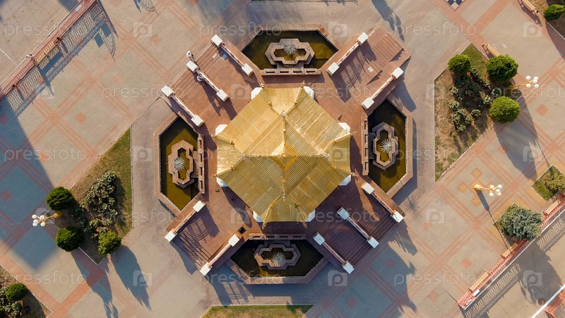 Элиста, Россия.Пагода семи дней - пагода на центральной площади Ленина, взгляд с воздуха, голова над кадром