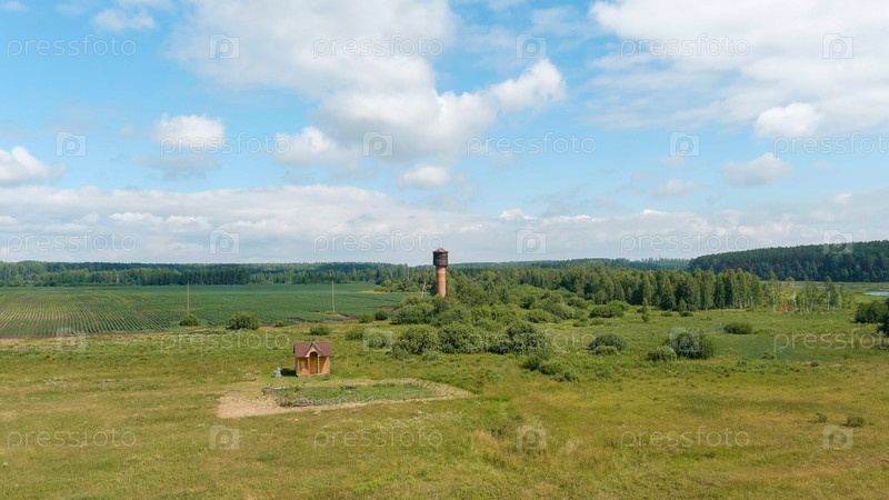 Россия, Урал. Летающий над полями. ряды картофеля. старая красная кирпичная водная башня, вид с воздуха