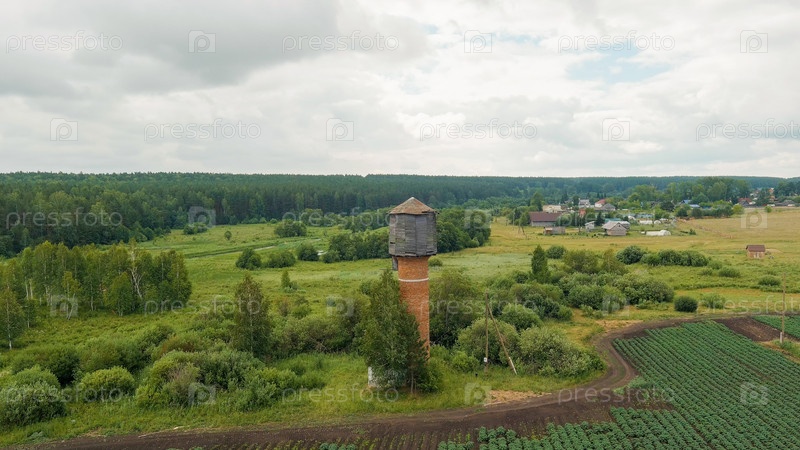 Россия, Урал. Летающий над полями. ряды картофеля. старая красная кирпичная водная башня, вид с воздуха