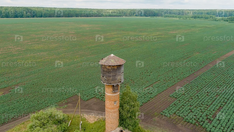 Россия, Урал. Летающий над полями. ряды картофеля. старая красная кирпичная водная башня, вид с воздуха