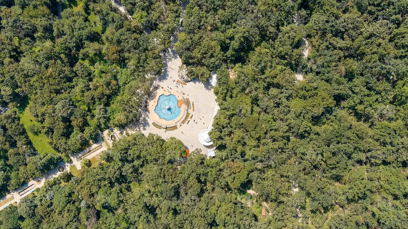 Железноводск, Россия. источник Смирнова. насосная комната Смирнов расположена на самом верху лестницы Каскад в парке, вид с воздуха, голова сверху
