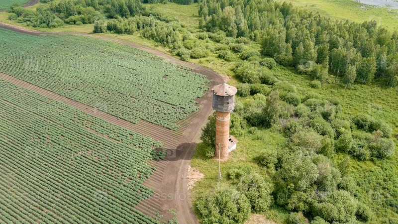 Россия, Урал. Летающий над полями. ряды картофеля. старая красная кирпичная водная башня, вид с воздуха