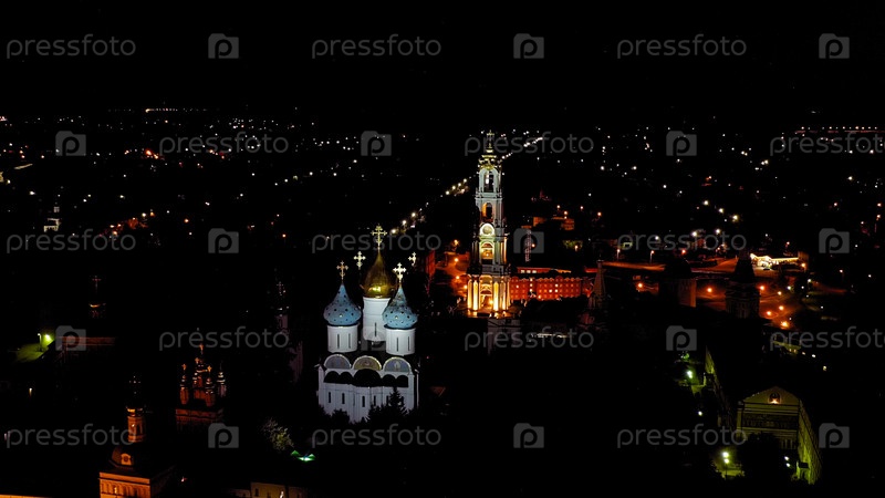 Сергиев Посад, Россия.Троица-Сергийская Лавра - крупнейший мужской монастырь Русской Православной Церкви с долгой историей.Расположен в центре Сергиева Посады.В ночное время вид из воздуха