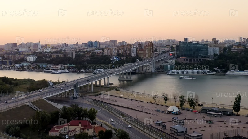 Ростов-на-Дону, Россия. Темерницкий мост через реку Дон. Время захода солнца, вид с воздуха