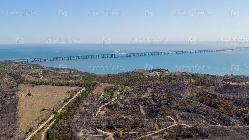 Керчь, Крым. Вид на новый крымский мост. Керченская крепость. Чистая погода, вид с воздуха