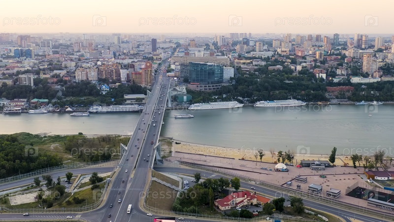 Ростов-на-Дону, Россия. Темерницкий мост через реку Дон. Время захода солнца, вид с воздуха