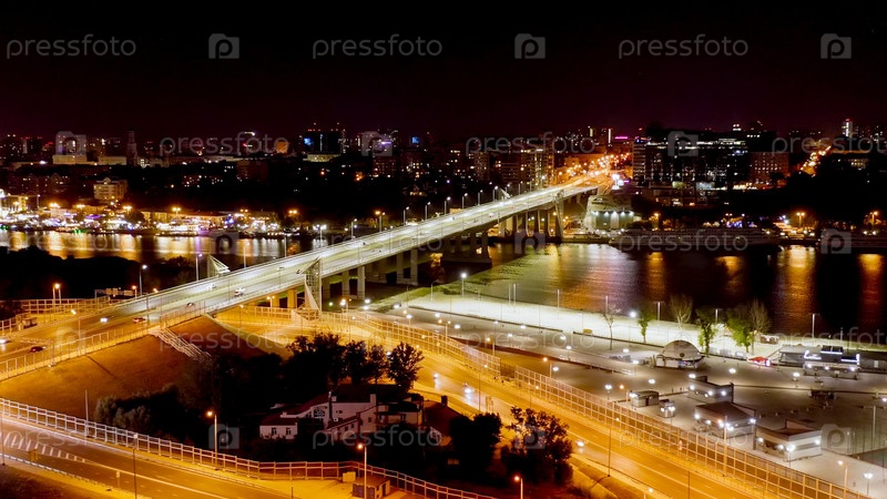Ростов-на-Дону, Россия.Ночной вид Ворошиловского моста через реку Дон, взгляд с воздуха