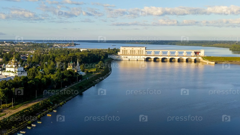 Угличская ГЭС на реке Волга в Ярославской области Часть Волко-Камского каскада гидроэлектростанций Раннее утро, вид с воздуха