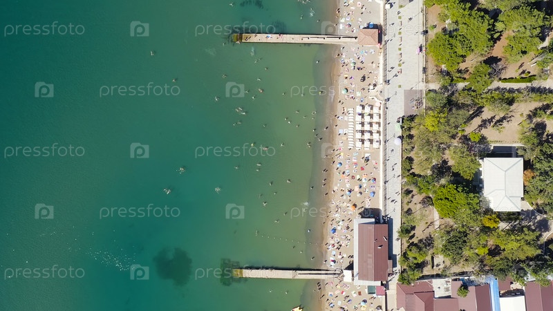 Судак, Крым. набережная Судак. побережье Черного моря с пляжами и людьми, взгляд из воздуха, голова над выстрелом